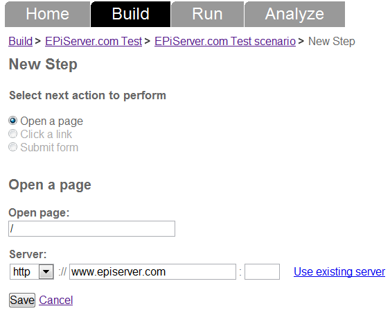 Click “Add step”. Choose “Click a link”. LoadStorm will now download your front page and provide you with a list of links on the page that can be clicked. Choose the “Contact me” link. Click “Save”.