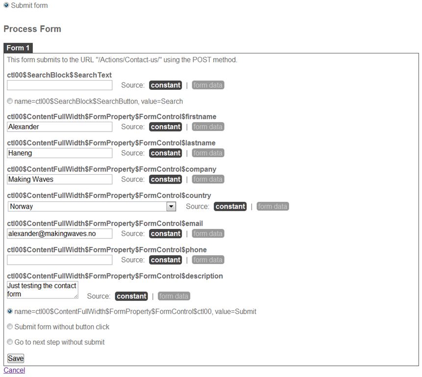 Click “Add step” and then select “Submit form”. LoadStorm will now download the page and provide you with all the form fields. Fill them inn and choose how you wan to submit the form.