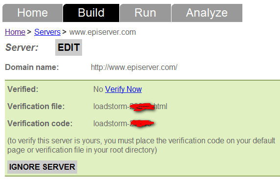 You will now see a list of servers that is being tested in your scenario. To be able to test a server you first need to verify it (if not you could potentially use LoadStorm as a DDOS attack tool). To verify a server simply click the “Verify” button. You will now get a page with a file name loadstorm-xxxxx.html. You need to create a file with this name on the root of your site so that LoadStorm can verify that you are the owner of the site.