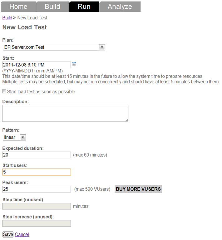 Click the Run tab and click “Add load test”. Choose the plan you just created, set the time for when you want the test to be run (and how long), and how many concurrent users you would like and how you want the traffic to increase (we want to test the application until it breaks, so we need to start small and scale up)
