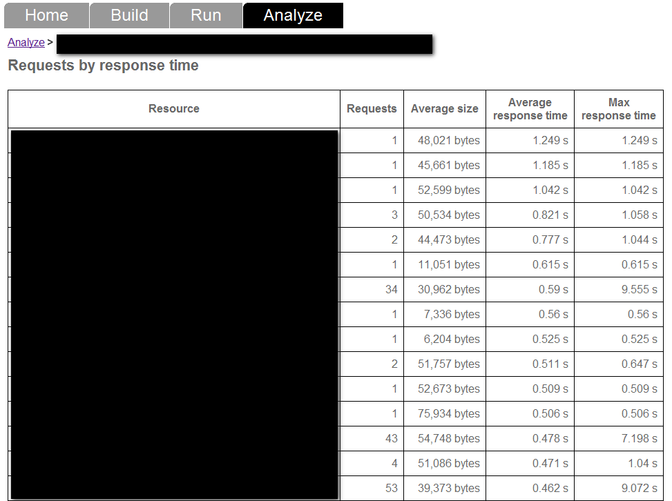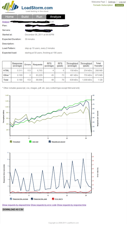 The key performance indicators to look at is average response time as the load increases and the number of errors. If you start seeing a lot of 5xx errors then you know that your application is breaking under the load. In the report above you see that not even 190 concurrent users can break it (I have scheduled a new test with 500 users later today). The spikes in the lower chart can be ignored since further investigation shows that they are anomalies not caused by the application.