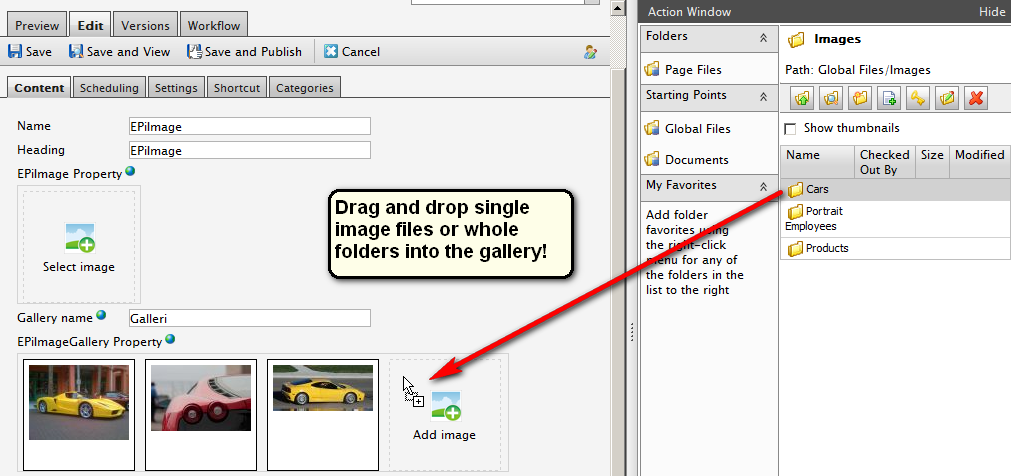 One of the killer features of EPiImage is the ability to drag and drop image files from the file management action window and straight into the gallery. You can even drag whole folders of images! In version 2.0 the loading of dragged and dropped images is much better and it now shows a loading indicator.