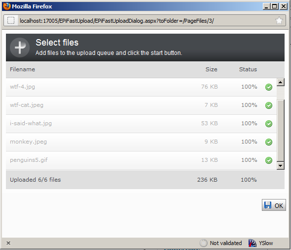 To make a long story short it all started with Ruwen Jin who created Aurumio.EPiServer.Integration.PlupLoad, an EPiServer module that integrated Plupload. Sadly it was poorly documented and had a few problems (especially with chunked uploads). Sveinung Myrlid at EPiServer Norway took the best parts of the module and made Plupload work with EPiServer Relate. We happened to meet at lunch one day and we started discussing how cool it would be to get this working 100% in EPiServer CMS. My colleague Sigve Fast and I got some code and some important pointers from Sveinung, and soon we had a PoC. After a bit of clean up and refactoring we ended up with EPiFastUpload!