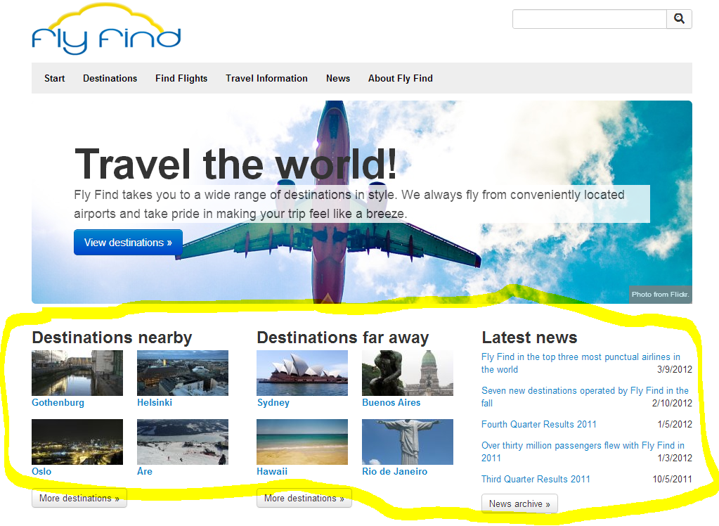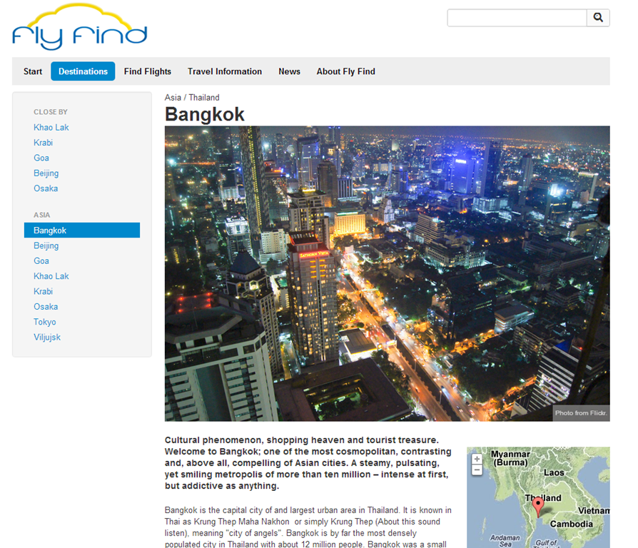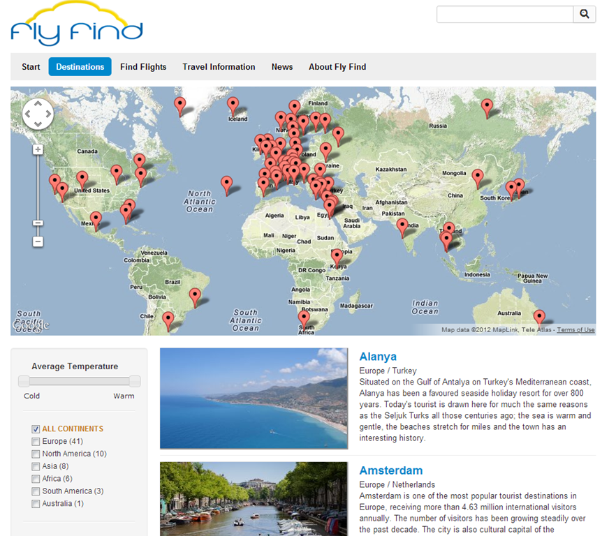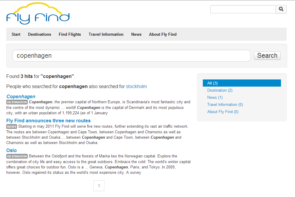 Start of by going to http://flyfind.demo.episerver.com. First thing you should notice is that pretty much everything on this site is driven behind the scenes by Find – both used as a search engine – but more importantly as a tool to allow advanced navigation for users to get to business critical information. Since this is an airline the important stuff is mostly destinations you can fly to – and the actual flights themselves.