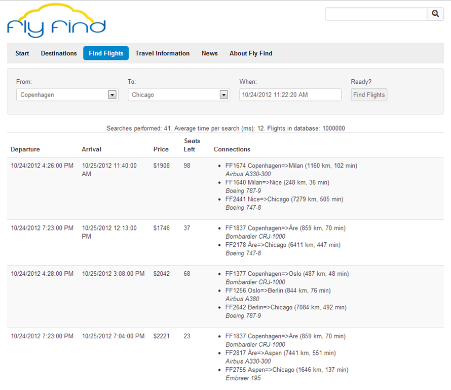 Now, for this demo I don’t really care about the e-commerce aspect of completing a booking, but I figured that allowing visitors to find flight connections that takes them where they want to go would be a fun challenge – and at the same time it would be a nice demo of the great performance Find can produce when searching in large datasets (such as flights). Personally I’ve always been fascinated by AI and AI-like technologies so this seemed like the perfect time to dip into the magic hat and pull out the good old A* algorithm for shortest path finding – and modify it slightly to use Find for querying and return multiple paths to choose from. But before we dive into the details, try it out: http://flyfind.demo.episerver.com/Find-Flights/.