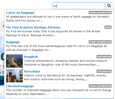 The Search-as-you-type is made possible with some clever javascript and a nice little http-handler, called QuickSearch.ashx. It searches for any item where the Pagename contains what has been typed – and returns the object..And if it’s a destination it’ll use EPiImage to resize a nice little thumbnail for you (which of course is cached first time generated). We use the base class of all pages on site in the query, EditorialPageBase – to make sure we get them all.