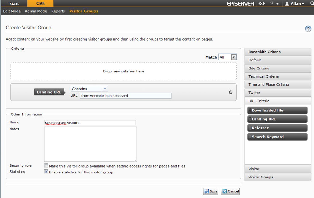 To make it easier to do this, I used the free Google Chart API that supports QR codes and plugged it in. By default, when you open the QRCode tab, it will suggest the public url to the current page as the text to encode. But you are free to change this of course. It can be any URL or textual message. A typical usage might be to include a query-parameter in the URL like “?from=qrcode-businesscard” so you can later personalize content to the visitors that arrive at your site from the QRCode like this: