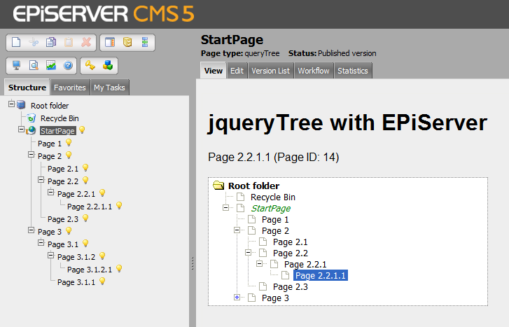 The code mirrors the pagetree in EPiServer and shows selected pages in a result div.
