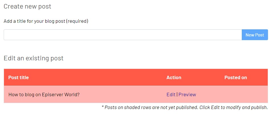 Ready, set,Go! Writing your first blog post. You create and manage the blog post from the "Manage your blog posts on Episerver World" page, you can find the link from the Blogs front page. @Episerver world team, if the user is logged in and has blogs enabled then could the Episerver World 'Blogs' main nvaigation have a child 'Manage blogs' entry?