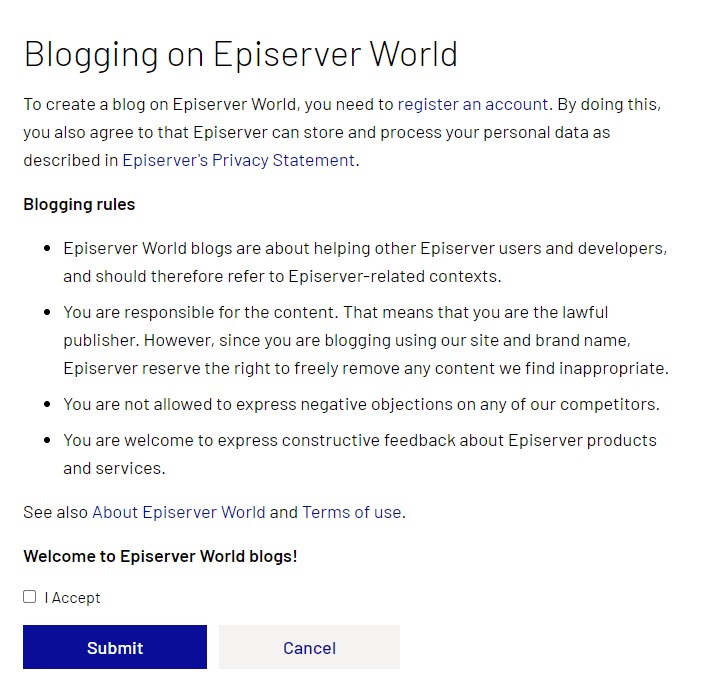 So there are some limitations, extra click workflows but in overall this is a really easy way to start blogging on Episerver World and sharing for the Episerver Community.
