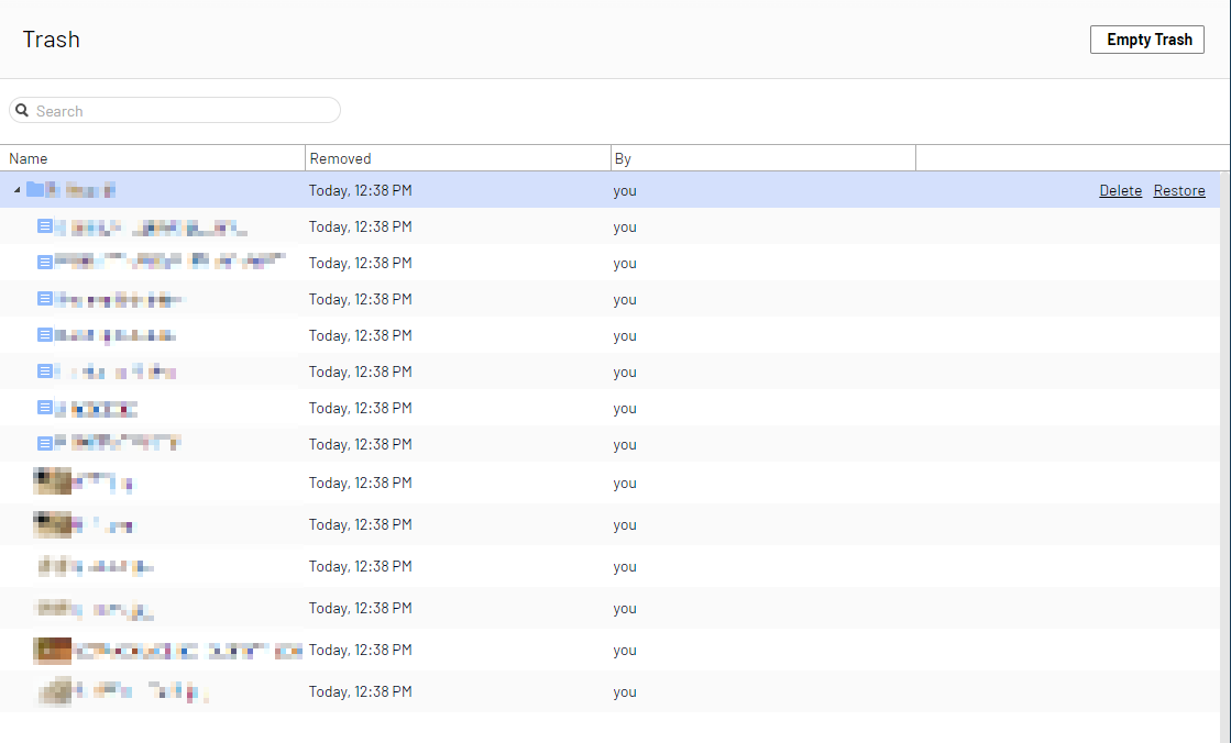 Before I moved the content to Trash, I had emptied the trash, so all content is now something that can be emptied from trash. In our case the content was the content folder so all content inside it can be seen here too. You can hover your mouse cursor over the folder and you can see it has the content id we just moved (like double checking). Next step is to delete the content from trash, you can use the "Empty Trash" button or one by one delete item(s).
