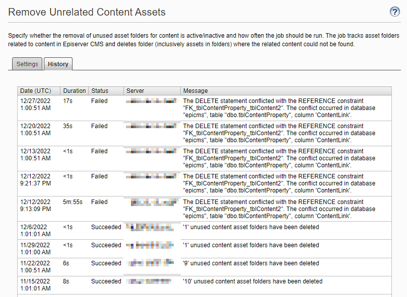 Our Remove Unrelated Content Assets scheudled job started to fail with message "The DELETE statement conflicted with the REFERENCE constraint "FK_tblContentProperty_tblContent2". The conflict occurred in database "epicms", table "dbo.tblContentProperty", column 'ContentLink'.". All we knew some heavy content deletion and imports were done, but that is normal work supported by CMS (maybe not done in such magnitude often, but anyways). @Optimizely hint, that error message in scheduled job views is pretty useless - we have no real data like the offending content id to easily try to understand what is wrong.