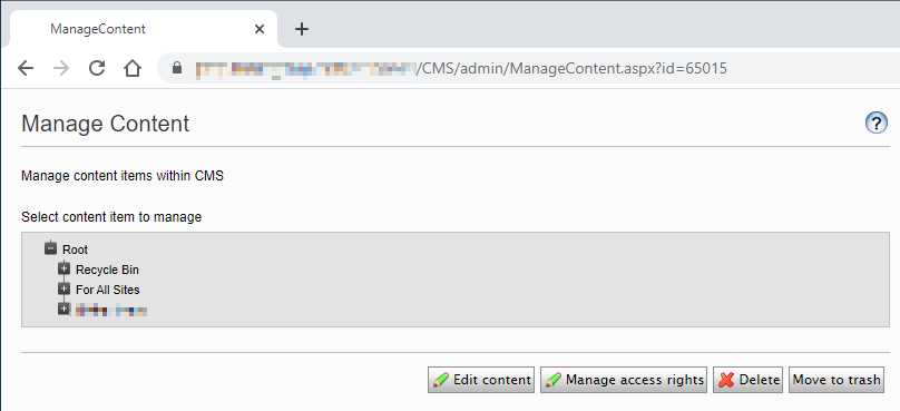 But what about the "Manage content" tool in admin view under tools? If you would just simply navigate to the "Manage content" tool you would see site(s) resources in hierarchial view and thats it, but there is an old trick. Right click "Manage Content" under tools and select to open link in new tab, switch to the new tab and look at the url, this should give you the hint that the page accepts content id as url paramter. Edit the url and enter the offending content id to the url, in our case ManageContent.aspx?id=65015 and hit enter.