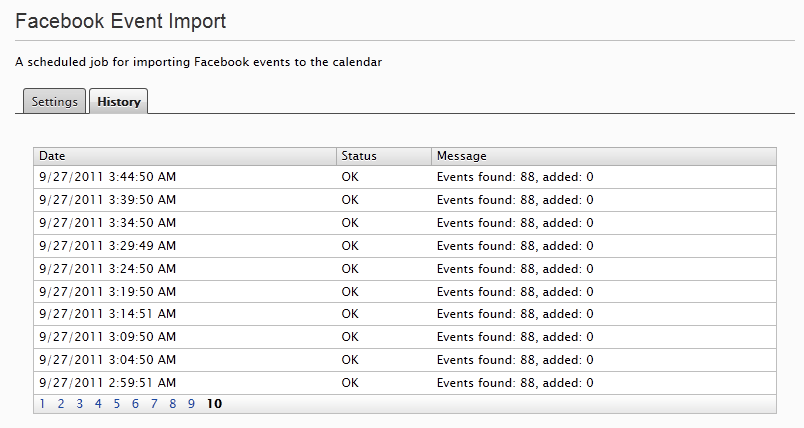 We are now done. The scheduled job will run and, using the Access Token we generated with our Facebook App, will pull in all the events from the PaperBagDating page and push them into EPiServer. This could be expanded to much more, naturally – like RSVPs, updates to existing events and all the rest, but it shows the concept well enough and I prefer to keep things simple anyway. I have this scheduled job running every five minutes, and here is an example of the output: