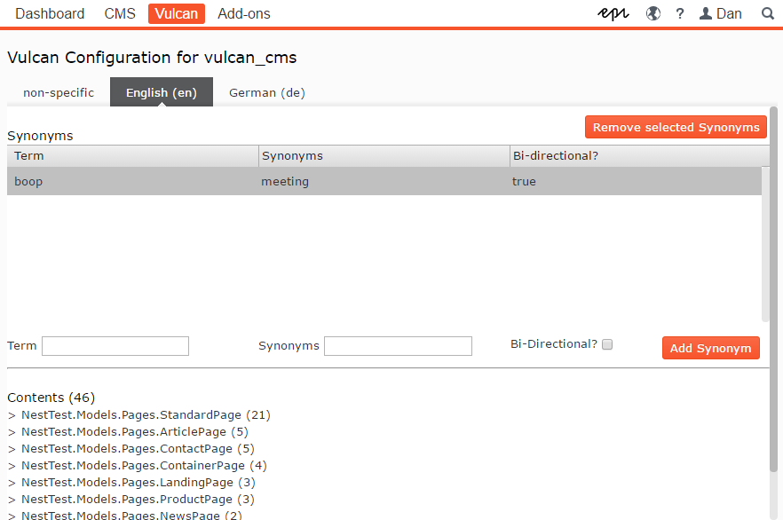 Today marks a significant milestone in the journey of Vulcan, the lightweight Elasticsearch client for Episerver. It’s going onto the Episerver Nuget Feed which will make it more readily available to more people, and it now has a UI. It’s still very lightweight, but it now supports index-time synonyms. Unlike Episerver Find, which supports more dynamic synonyms, Vulcan processes synonyms on objects at index time and as Vulcan manages your objects for you that means there has to be a way to register synonyms with it. For now, that’s all the UI does although maybe it will be extended later. Note that once you’ve added/removed synonyms, you’ll need to a re-index your content with the scheduled job. And yes… I’m useless at user interfaces, and so it’s basic. Very basic. But it does the job! Enter the synonyms comma-delimited. I also added a small count of types just so that you can see what each of your language clients contains.