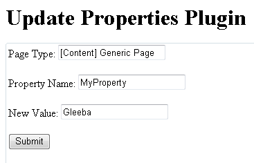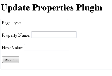 Which allows you to set a Page Type, Property Name and New Property Value – all as String – and, once submitted, will iterate through all pages in your site (from StartPage down) and set that property value. In my test instance, 297 pages took about 25 seconds to run.