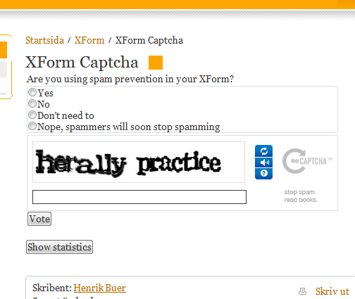 I’ve decided to do two different methods. The first is integration of reCAPTCHA in XForm. Here’s an example how it can look like with reCAPTCHAS “clean” theme.