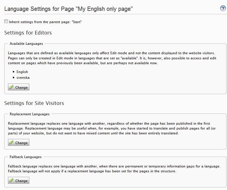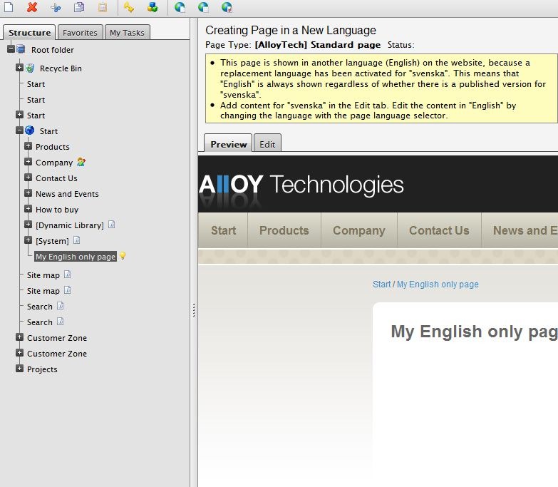 Another change is that it’s now possible to preview a page that has no information for the selected language but is visible due to language settings. The following screen shot shows a page that does not exist for Swedish but is visible in English due to replacement language settings.