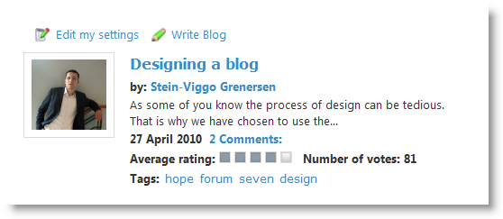I added two links at the top of the Personal Blog Start Page Template (only visible on the user’s own blog start page) – one for editing the current page and one for creating a new Blog post.