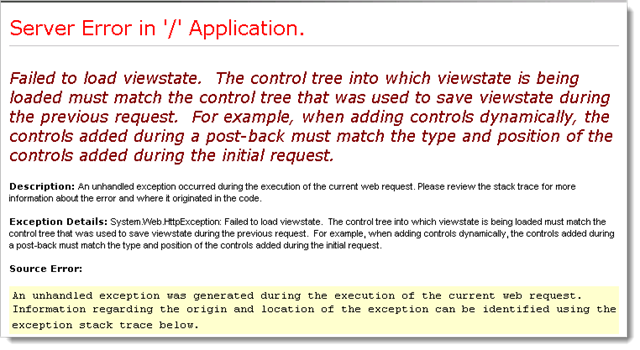 Failed to load viewstate. The control tree into which viewstate is being loaded must match the control tree that was used to save viewstate during the previous request. For example, when adding controls dynamically, the controls added during a post-back must match the type and position of the controls added during the initial request.