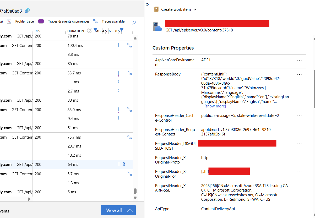 To go further, I introduced a middleware component to log the full request and response cycle for API calls. This middleware captures request and response bodies, headers, and timing, and sends a single 'RequestTelementry' entry to Application Insights with custom properties such as cache status.