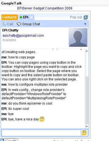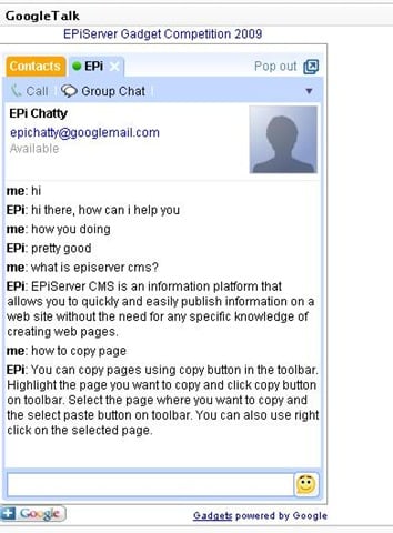 The main idea behind this is to have Google Talk client embedded as a gadget on dashboard and run EPiChatty as a console application which can interact with the user and give appropriate response.