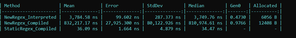 I knew StaticRegex should be the best, but I was surprised to learn that even with caching and lookup, the Compiled regex is not only the slowest by a large margin, but also every expensive in term of allocations. It's a no no, especially in cases of hot paths! For inexperienced developers who think Compiled will solve the problem, it is, actually, creating a problem!