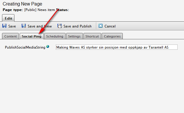 We’re now able to publish directly from EPiServer. Just to demonstrate we create a new page (News item), set a value for “PublishSocialMediaString” and click “Save and Publish”.