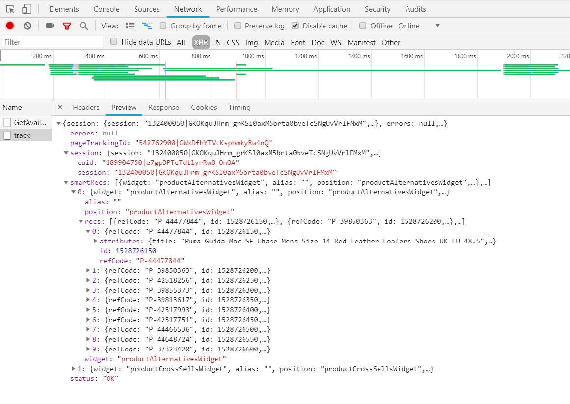 But now, instead of call to the end point of tracking service directly, we call to JS tracking API from the View. It will send a post request to web API with url '/episerverapi/commercetracking/track' and the tracking data collected in the client.