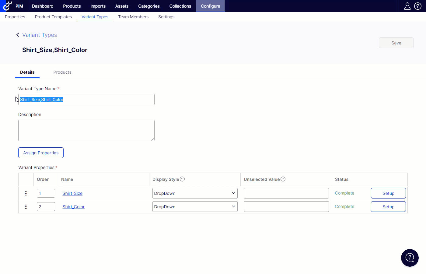 - Review the variant types and update names if desired. When we convert your existing data to the new data model we won't know appropriate names for each variant type so we will generate names using the variant properties. For instance, the variant type used by t-shirts in the above example will be named "Size,Color" and can be renamed.