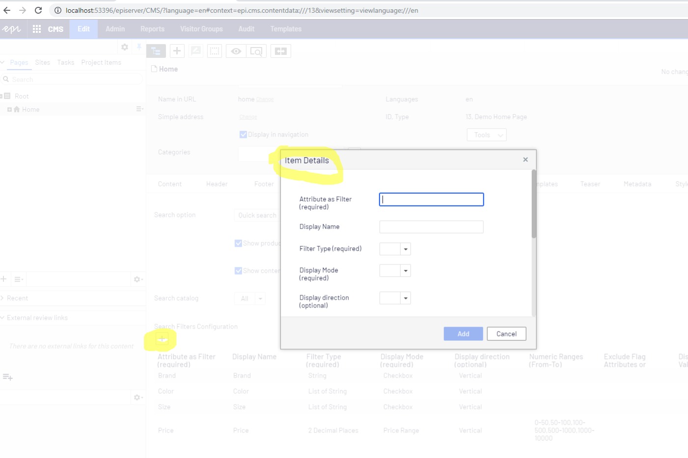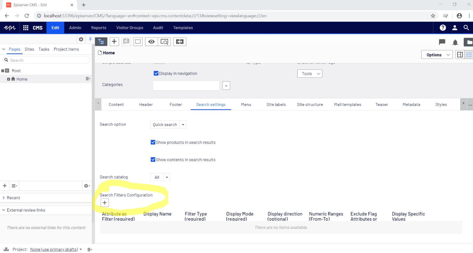 In Episerver CMS > Home page, under Search settings tab, we’ve added a new field called “Search Filters Configuration” that allows content editors to dynamically define and configure the facets displayed on the search results page: