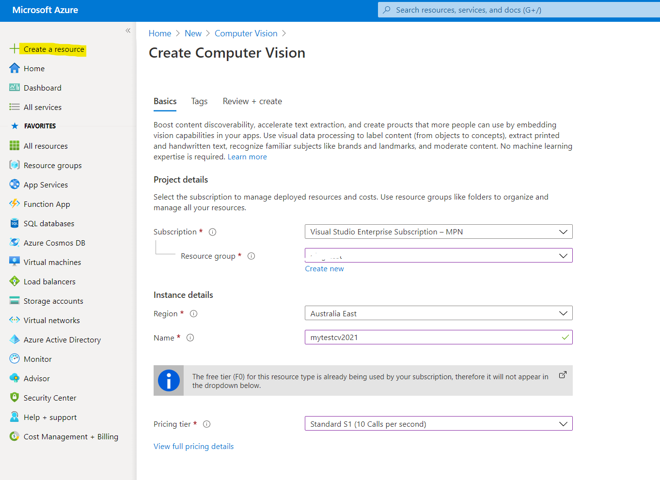 You need an Azure account. From Home page, click "Create a resource" > Search for "Computer Vision" > Follow steps (if you don't have any resource group, create one, it won't bite)