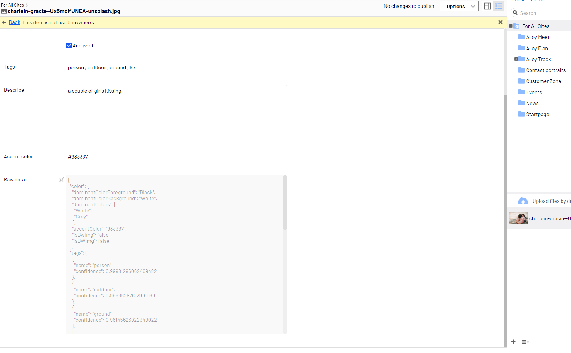 I'll demonstrate with the sample Alloy CMS site, MVC scheme. Hereby, I'll only give a decent integration for tagging and describing ImageData.