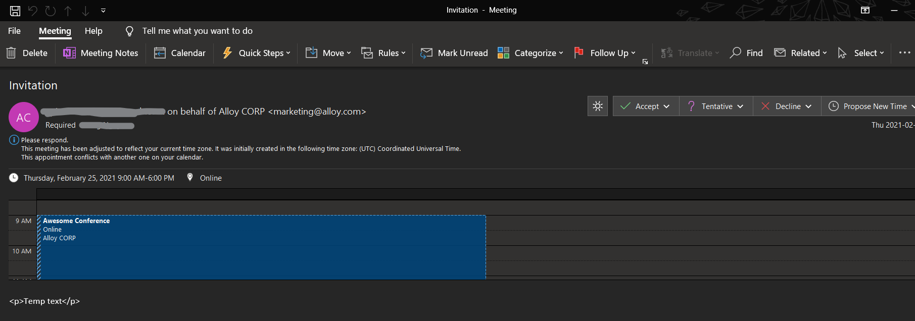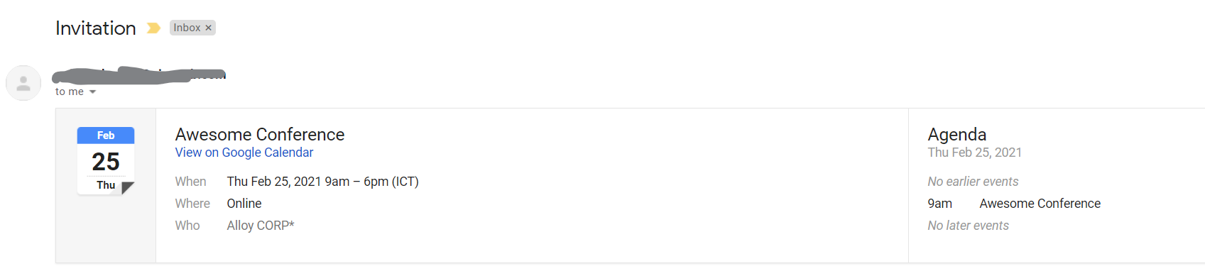 The invitation email needs an attachment with MIME type of text/calendar and an alternative view: