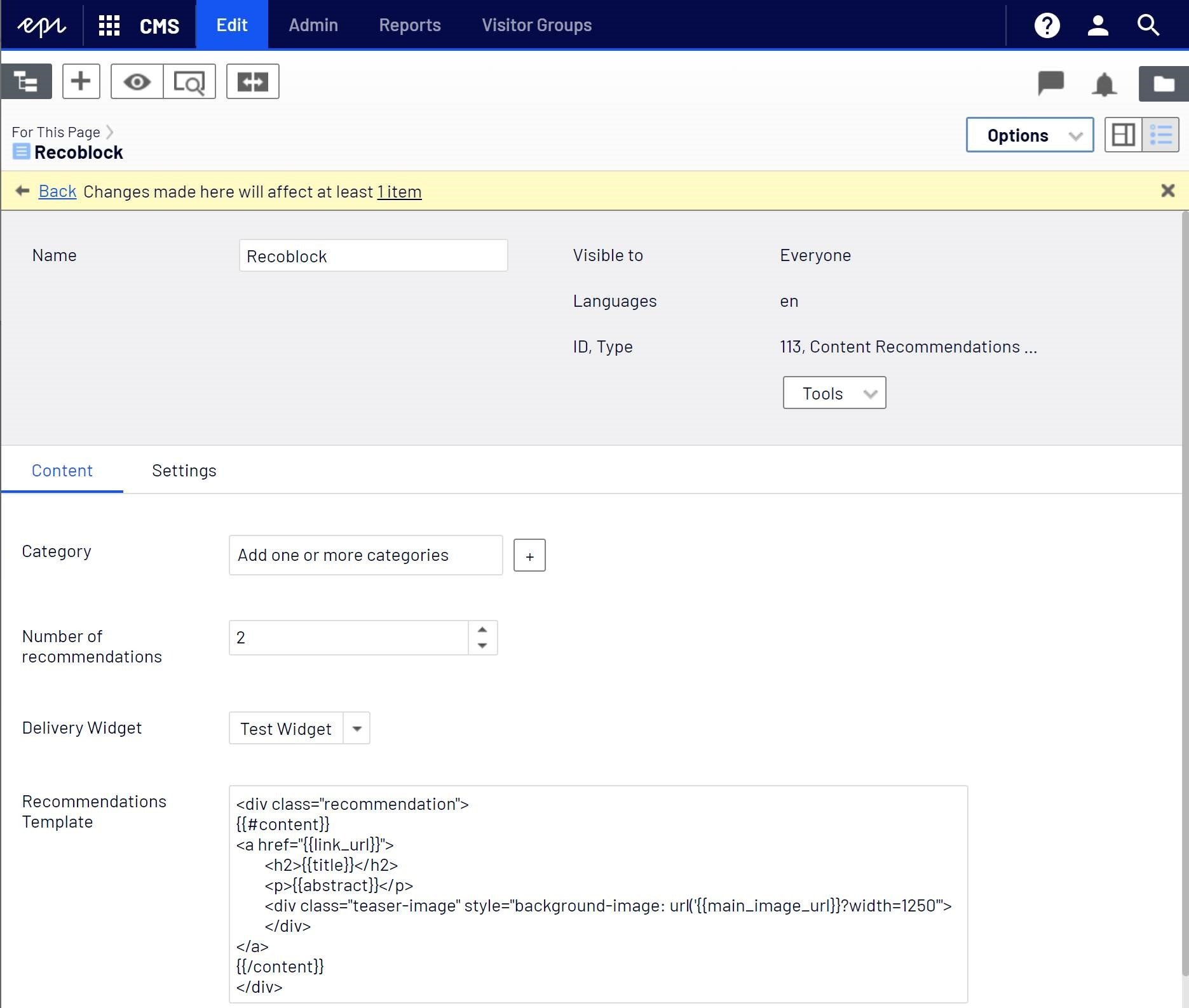 The Recommendations Template field is the workhorse of the rendering. Everything inside the {{#content}} {{/content}} mustache markup will be repeated for each recommendation item, and additional markup can also be included. Keep in mind that the recommendation template is rendered in the front-end and has no access to the back-end CMS APIs, or content object data. It only knows the JSON that is being returned from the recommendation server.