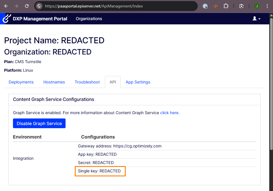 Be aware that anyone with your Single key can access the GraphiQL interface at https://cg.optimizely.com/app/graphiql?auth={singlekey}, which exposes your full content schema through introspection.
