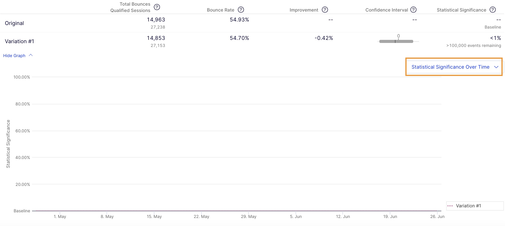 Tip: Use the below graph view in Optimizely Web Experimetation to look for any upticks in statistical significance for any of your A/A test metrics.