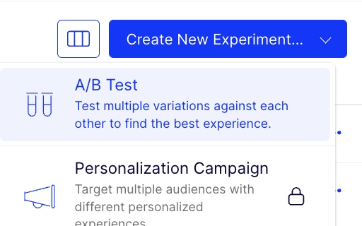 Once the tag has been installed, you can begin your A/A test setup. Similiar to how you would build an A/B test, the creation of an A/A test starts by clicking onto the Create New Experiment button in the top-right corner of Optimizely Experimentation and then selecting A/B Test from the dropdown menu. (Yes, A/B; but our B will remain our A for this test.)