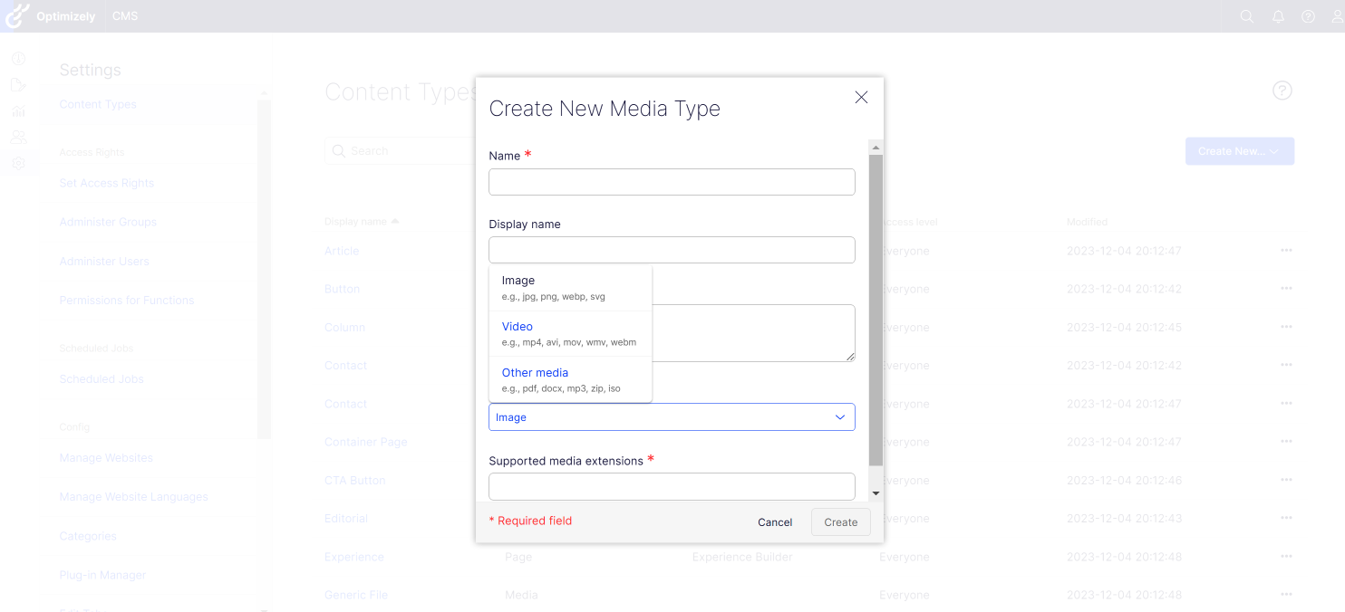 Users will need to specify which media type they want to create and which media extensions the content type is going to support.