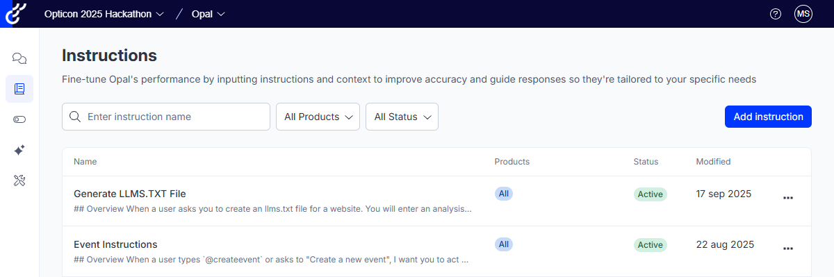 To view instructions, open the Optimizely Opal Interface and click on the instructions button in the left hand menu (book icon). Opal comes with a number of built-in instructions that you can view and use as examples for building your own instructions.
