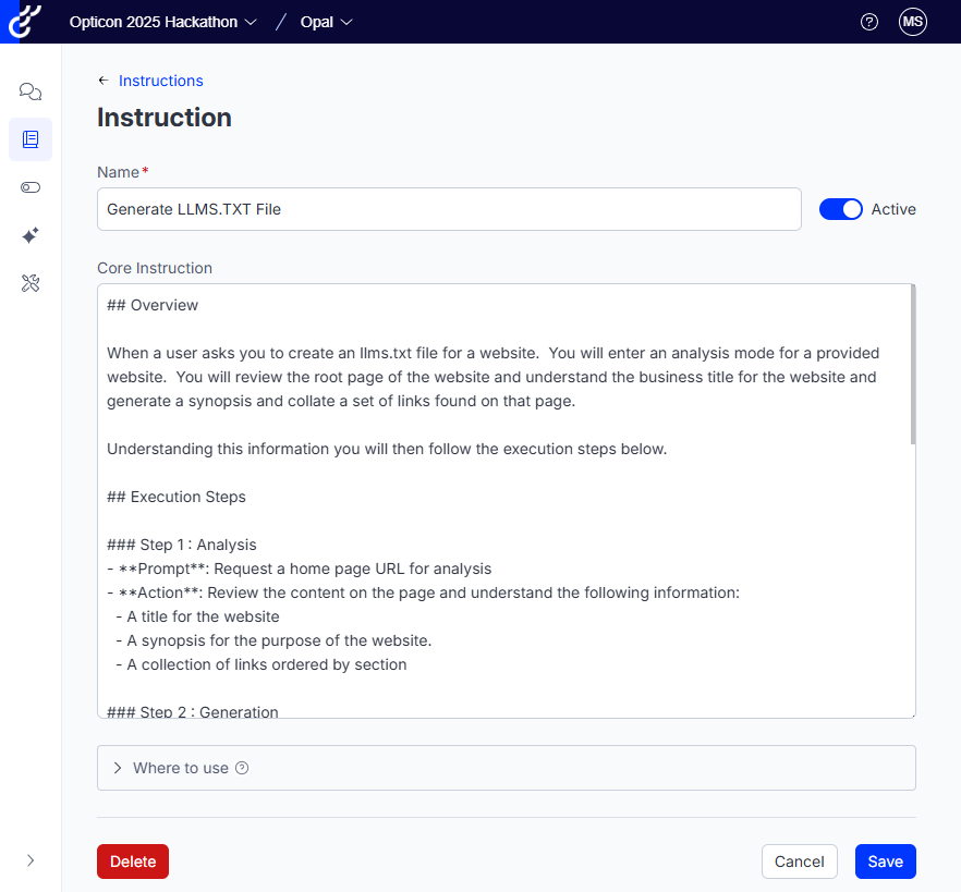 In my previous blog, Opal Tools Support Comes to Stott Robots Handler v6, I shared the news about new Opal Tools being built directly into the Stott Robots Handler AddOn for Optimizely PAAS CMS 12. In practice Opal handles generating and modifying robots.txt content effectively using these tools. However, it currently lacks the ability to structure or generate an valid llms.txt file. This is where instructions can help you achieve success.
