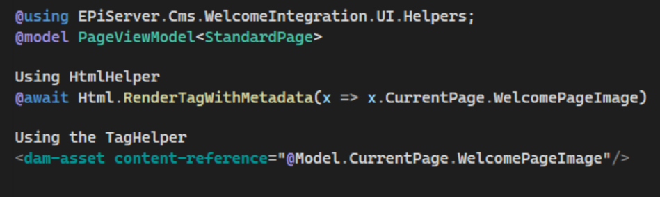 @using EPiServer.Cms.WelcomeIntegration.UI.Helpers;inside a.cshtmlpage of choice, as well as use the page model which contains aContentReferenceproperty - Then, call the