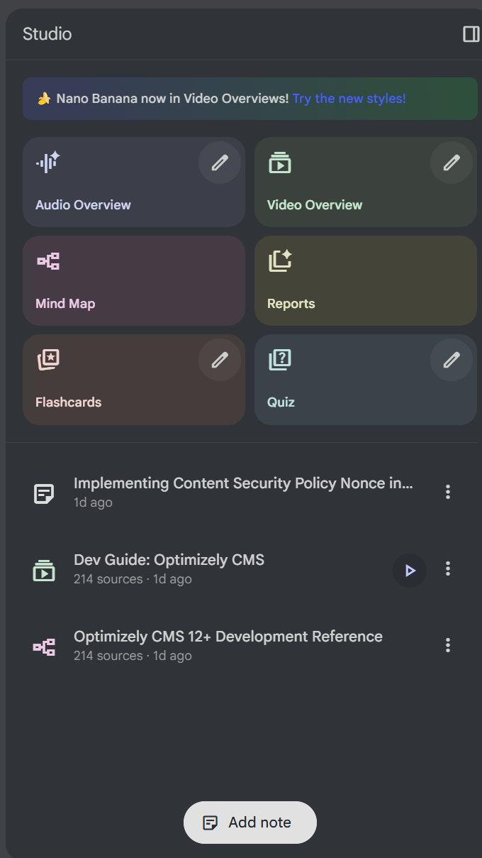 Using NotebookLM creates an amazing space for combining all of the information together and joining the dots. It allows output that you can consume as videos, audio (which allows for a podcast style custom learning), mid maps and note outputs. It really revolutionises learning and combining information and by plugging this in to development teams as well it creates a powerful place for many different activies either research, task planning or anything else.