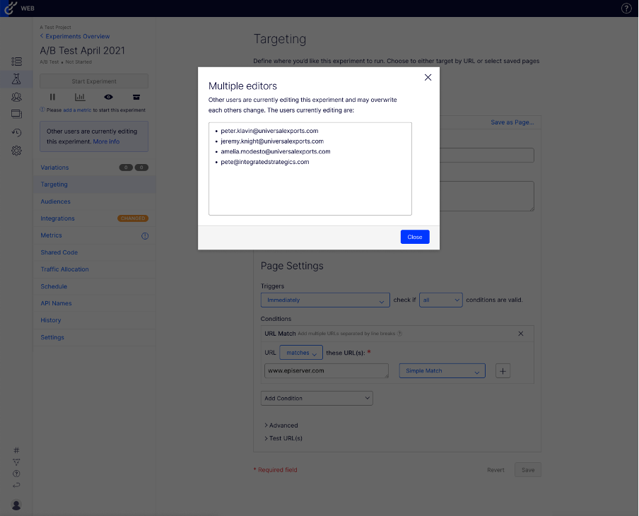 For example, experiment collaborators might work on an experiment for several hours only to see their changes being overwritten by someone else’s edits. This is a pain that has been known to be frustrating to users. Therefore, Optimizely is committed to making sure that our Web Experimentation product allows multiple experiment collaborators to edit an experiment simultaneously by informing active users what others are working on in real time. By collaborating live together, users will save time and have more visibility on others’ contributions.