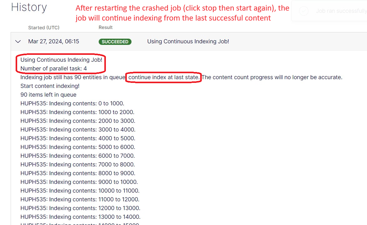 - Support continuous indexing job. In case the job has been crashed, you can restart and it will continue indexing progress from the last content that has successfully indexed.