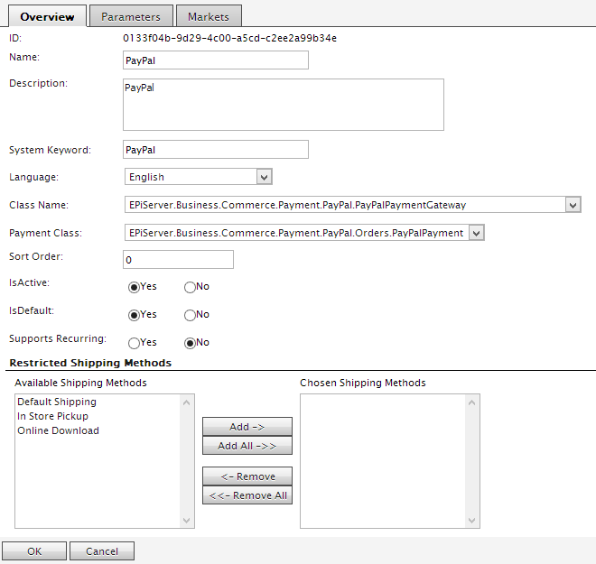 - Select Create new payment method. The System keyword must be "PayPal" (the name of the folder created during deployment). Class Name must be EPiServer.Business.Commerce.Payment.PayPal.PayPalPaymentGateway, and Payment Class must be EPiServer.Business.Commerce.Payment.PayPal.Orders.PayPalPayment.