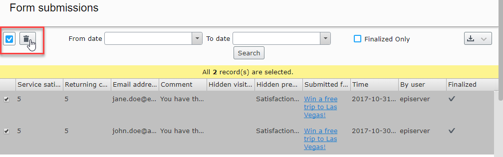 Previously, you could only select and delete submitted form data individually. You can now select and delete all records at once.